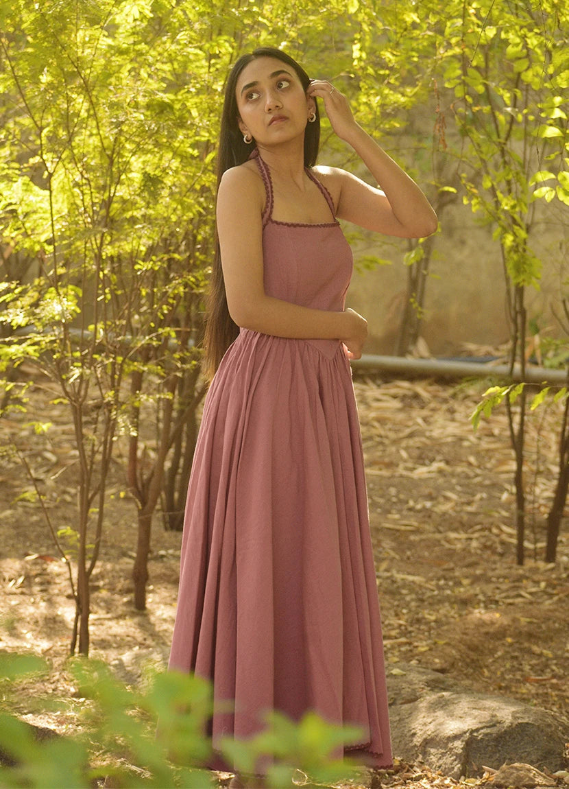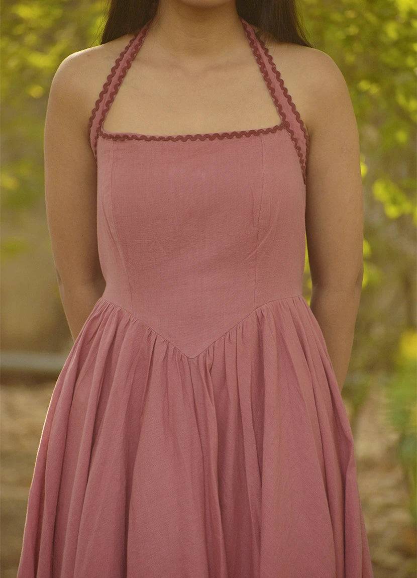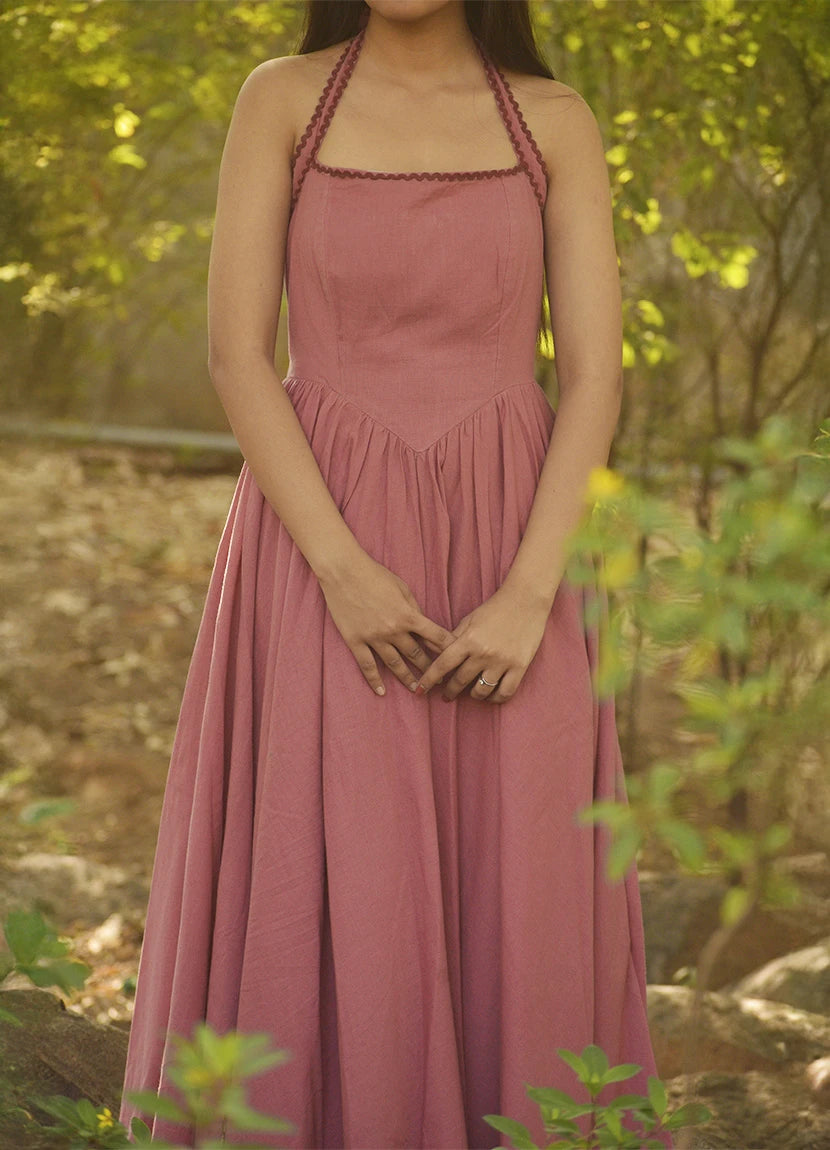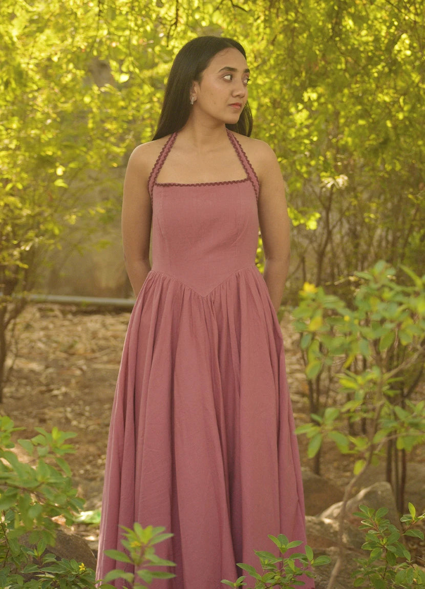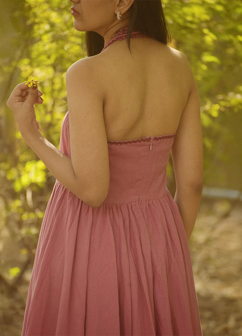 Delicate lace trims the neckline and hemline of this halter dress, offering a graceful and elevated silhouette. Designed with a neck hook strap and a back zipper, this fit & flare style also features pockets for added ease.