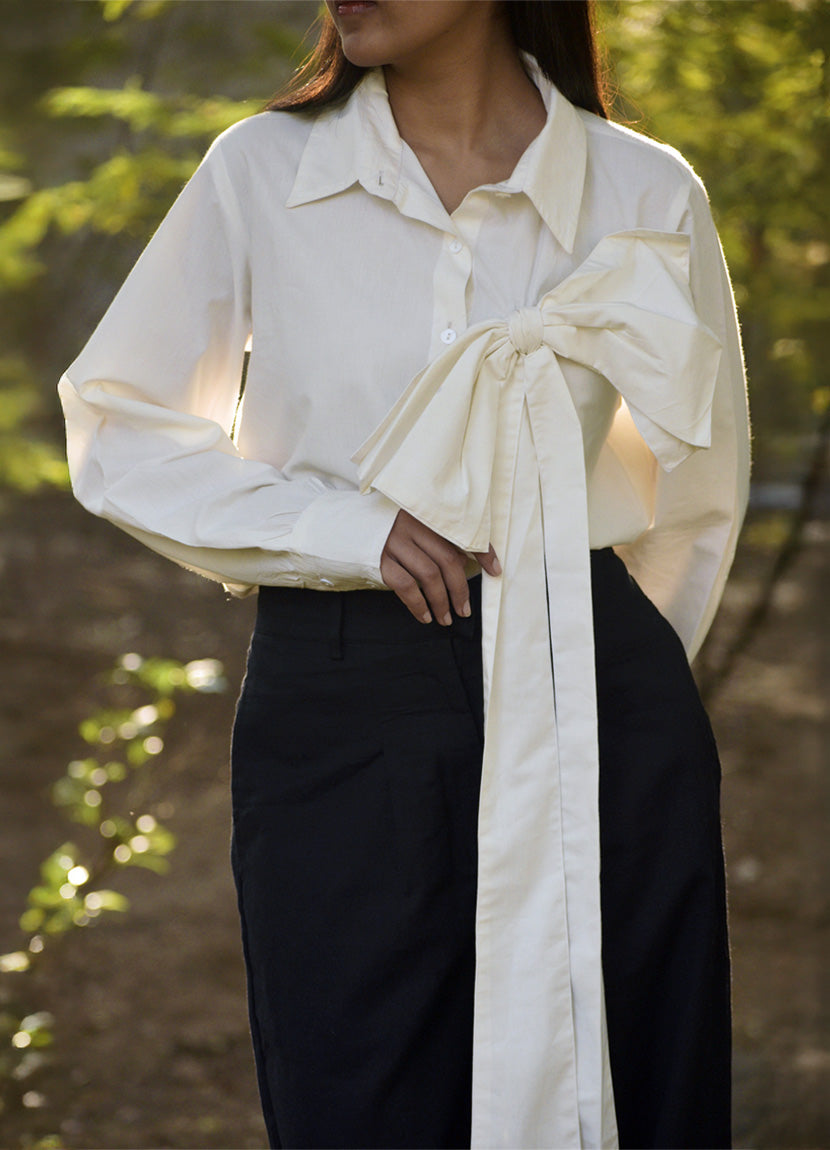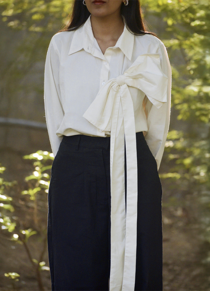 This classic white shirt gets a playful upgrade with an oversized bow detail at the front. Tailored with full sleeves and a relaxed fit, it’s a blend of statement and sophistication you can dress up or down with ease.